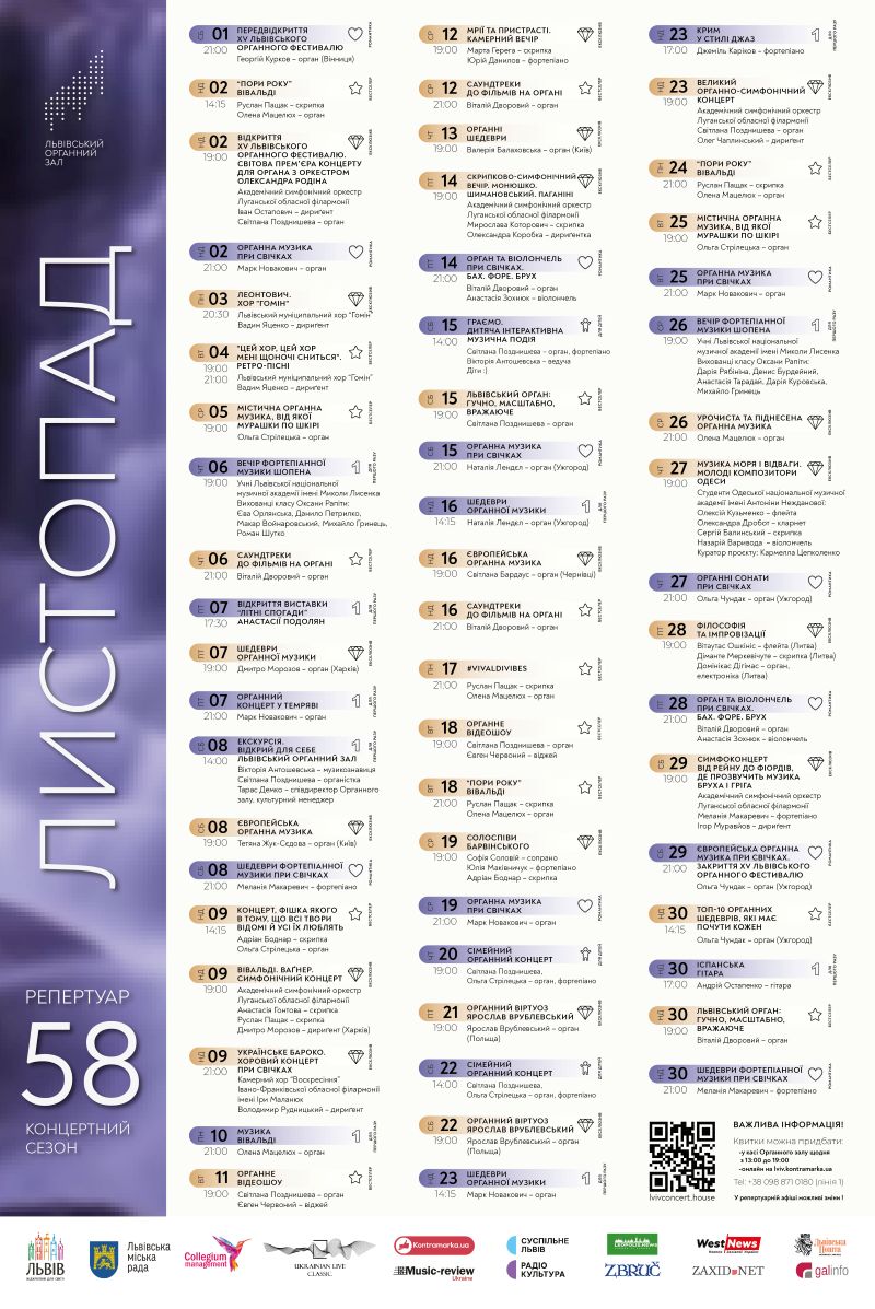 Не менш масштабними та захопливими будуть великі симфонічні вечори за участі Академічного симфонічного оркестру Луганської обласної філармонії, камерні виступи запрошених виконавців, і не лише зі Львова, а також улюблені програми від солістів органного залу.