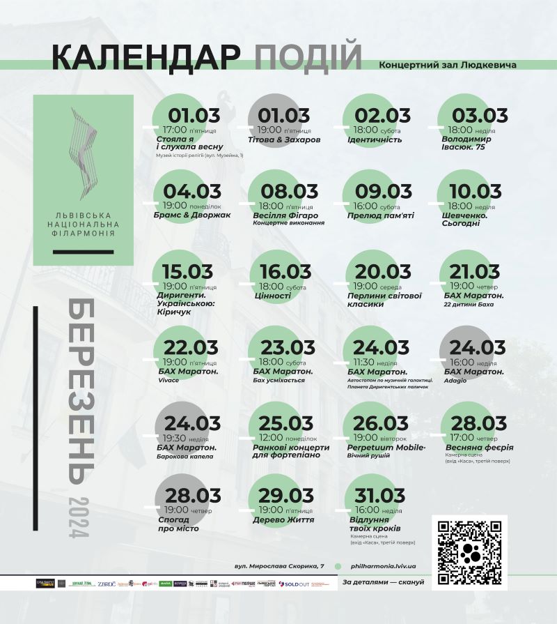 Весна у філармонії починається низкою подій, серед яких унікальний музичний марафон, присвячені Володимиру Івасюку та Тарасу Шевченку вечори, симфонічні концерти від талановитої молоді та родинні ранкові концерти.