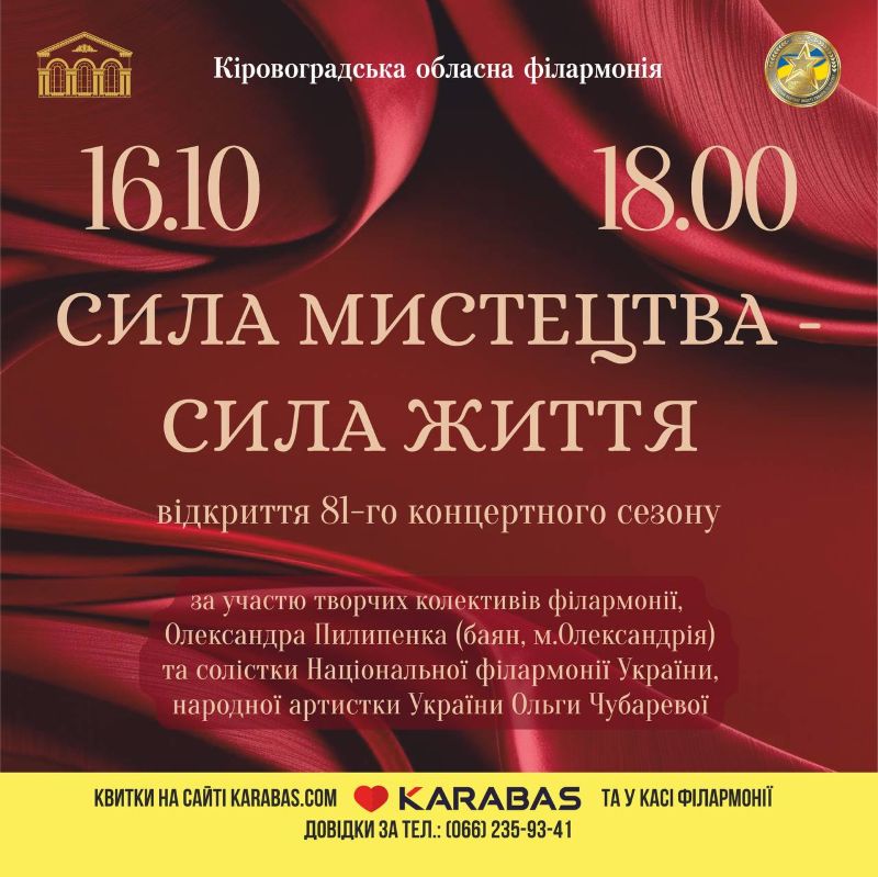 16 жовтня в Кіровоградській обласній філармонії відкриють 81-й концертний сезон під символічною назвою "Сила мистецтва - сила життя".