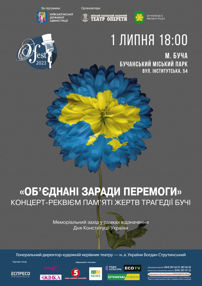 1 липня о 18:00 в Бучанському міському парку (м. Буча, вул. Інститутська, 54) відбудеться концерт-реквієм пам’яті жертв трагедії Бучі «Об’єднані заради перемоги», організований Національною оперетою України спільно з Бучанською міською радою. Меморіальний захід запланований в рамках відзначення Дня Конституції України.